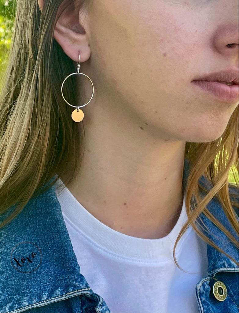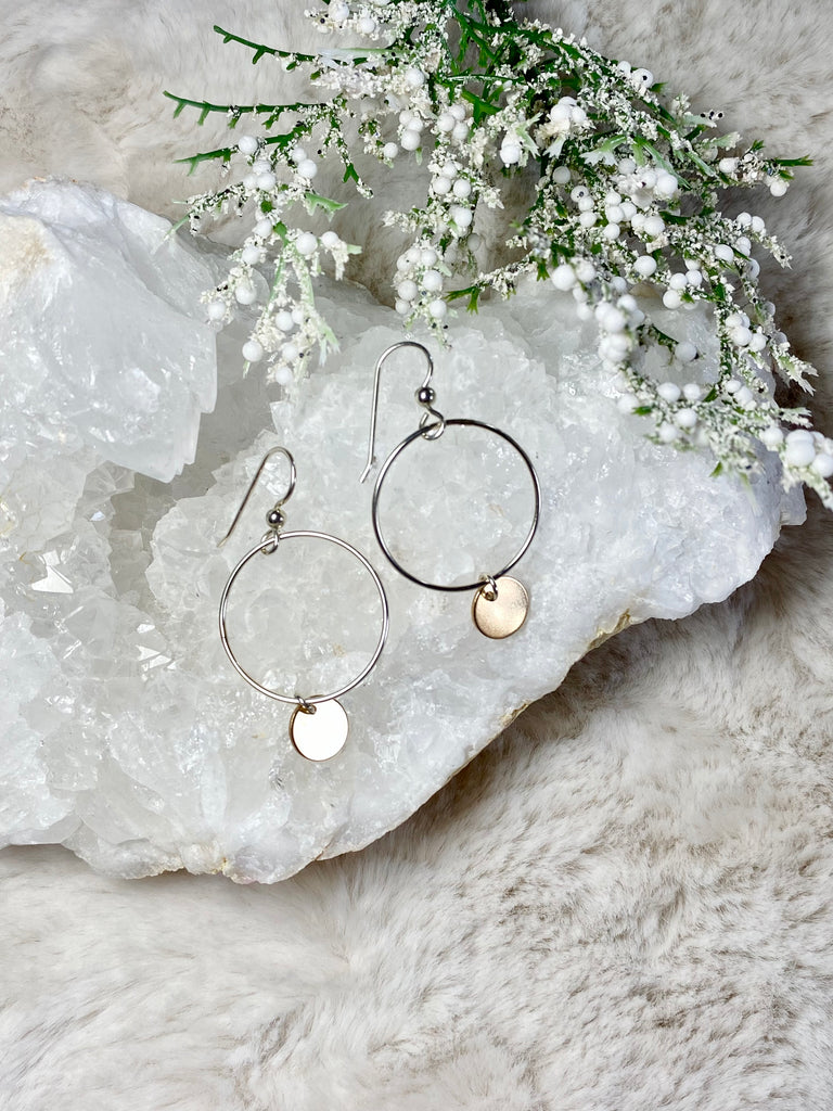The Aria earrings are so fun this earring is  light weight and easy to wear all day. Available in mixed metal or Sterling silver this is a 1” hoop with sterling silver or 14k gold filled accent. This is a gift any girlie will love.