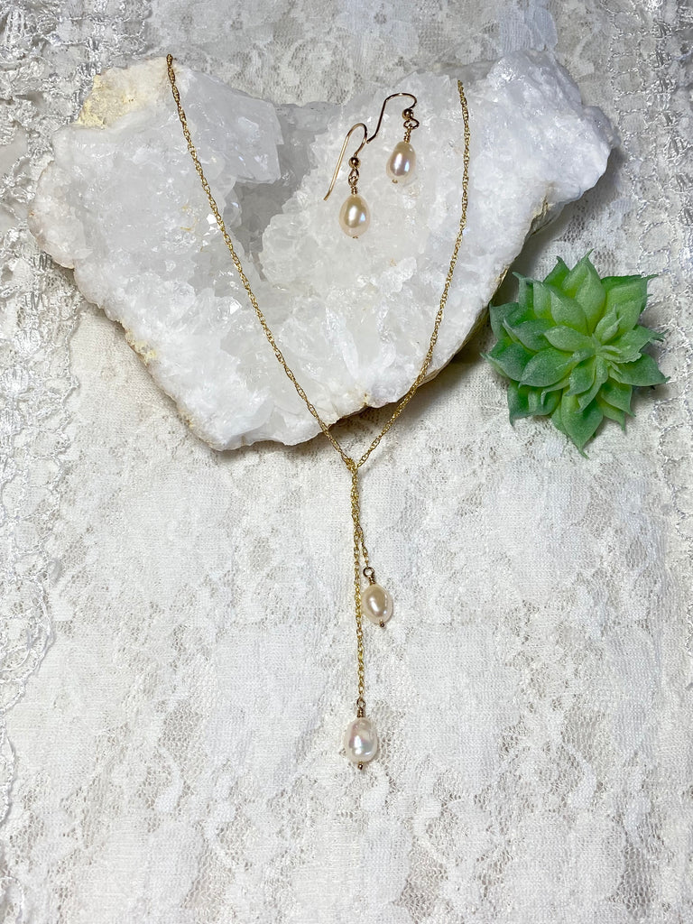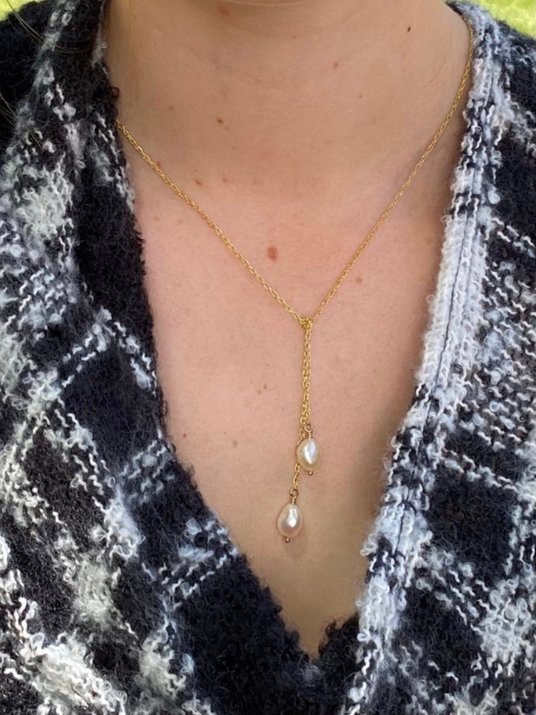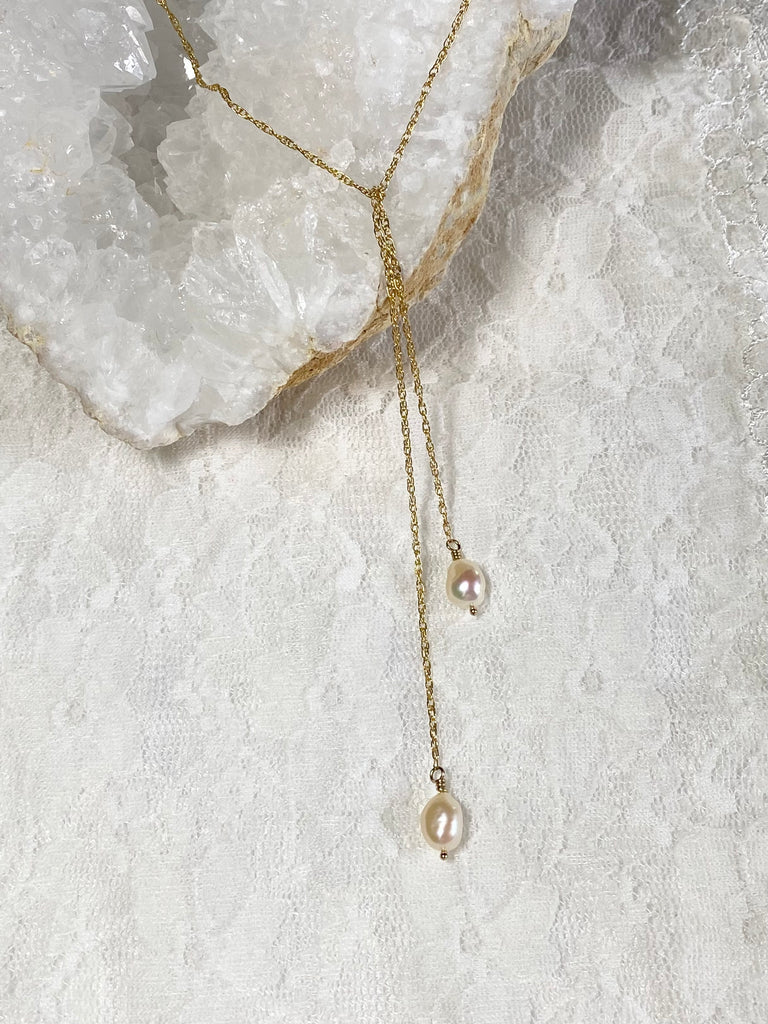 A gorgeous versatile Lariat design with a simple loop to adjust as a choker with center drop or adjust it lower to your liking its 14K gold filled with beautiful unique fresh water pearl center piece Available in 3 sizes 22” 27” 32” This is a beautiful versatile piece to add to you Jewelry collection. The thing we love about a lariat is you can were it short and conservative or long and dramatic. It will Dress up any outfit. It will be your favorite.
