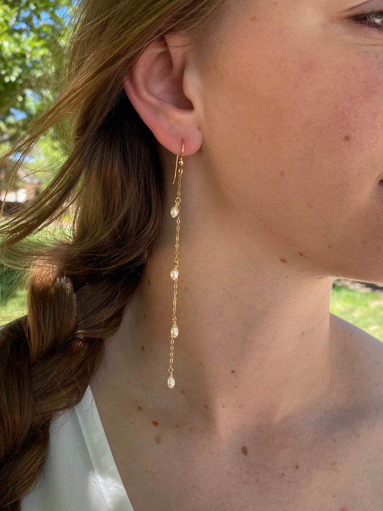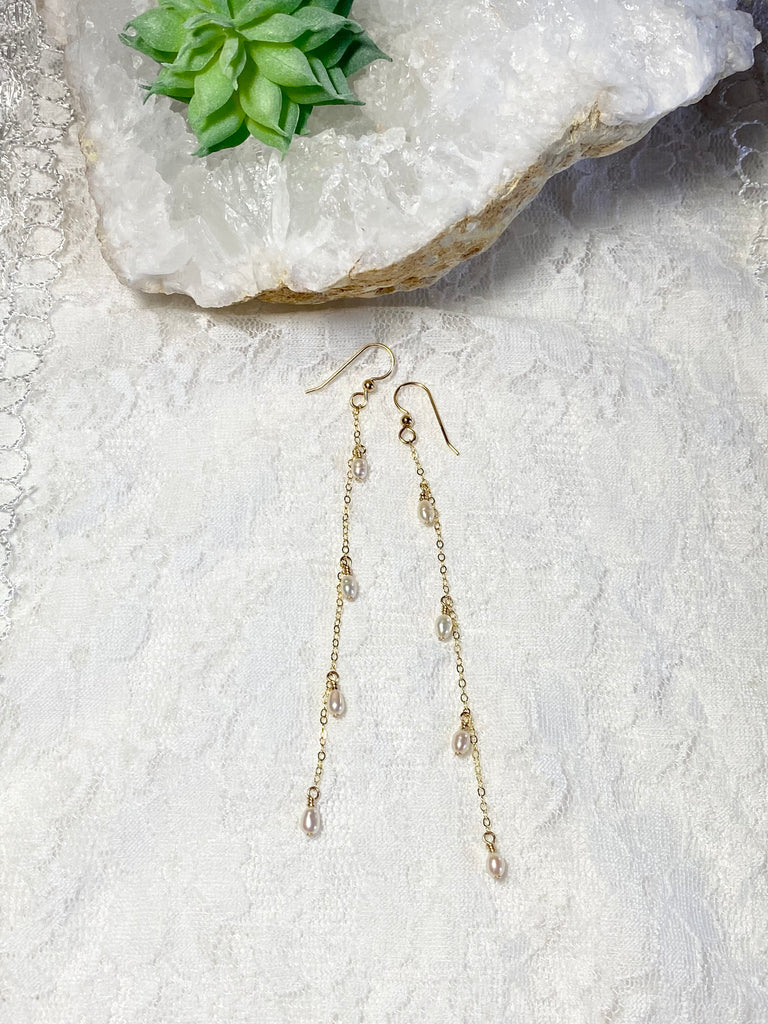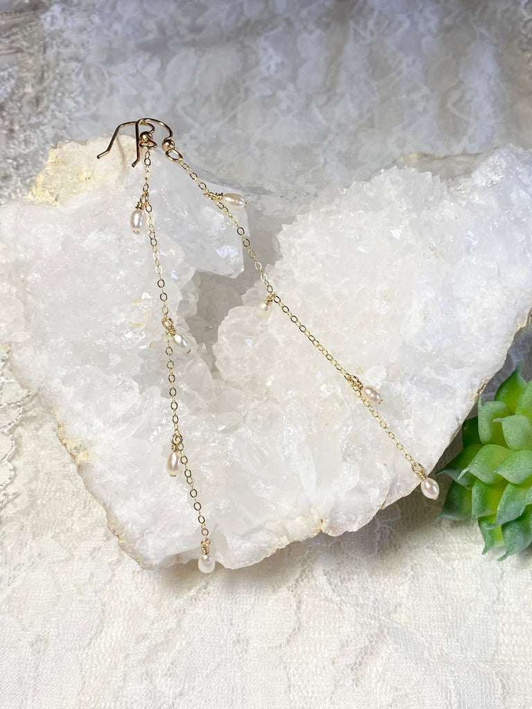 A simple but eye catching design we love this delicate dramatic pearl earring in 14K Gold Filled laced with tiny fresh water pearls. Available in 3” 4” This is a gorgeous earring beautiful any day and definitely wedding worthy you can’t go wrong with this one. Good for teen to adult