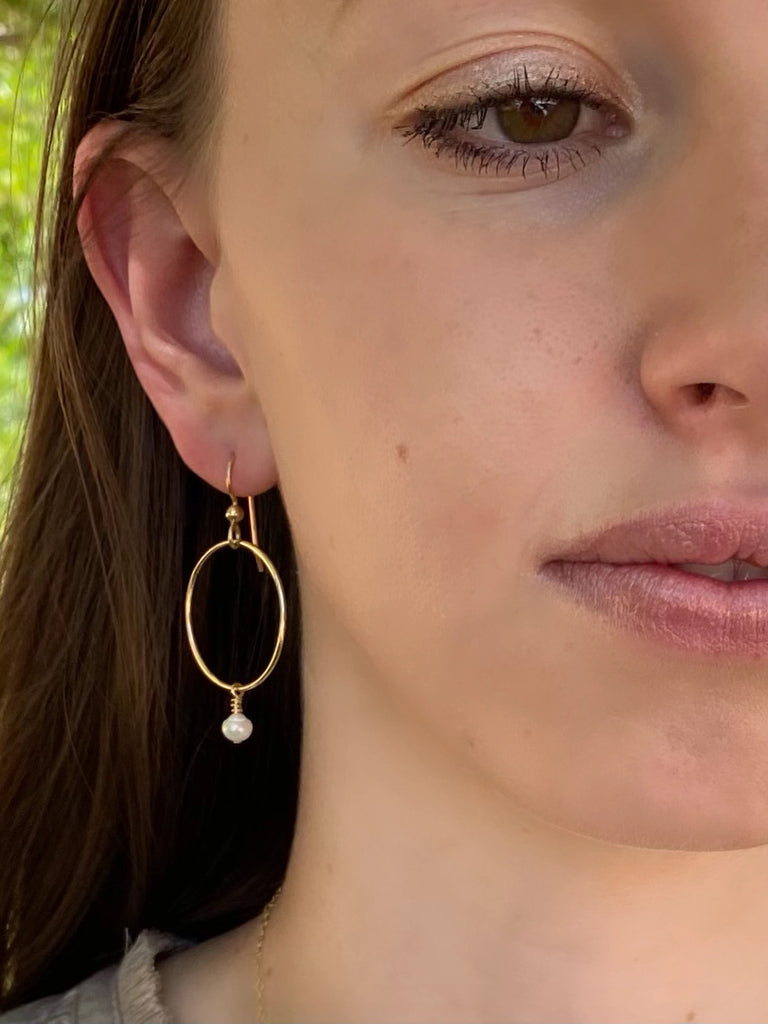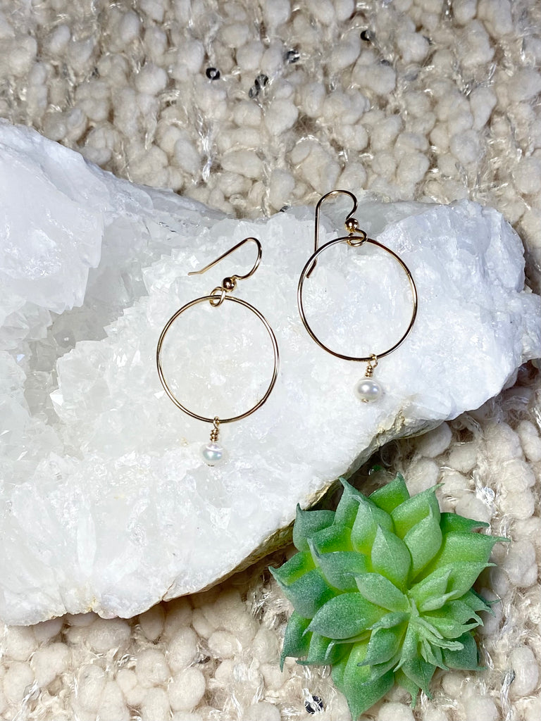 Our beautiful primrose hoop earrings designed with the adorable little fresh water pearl accent Available In 14k Gold Filled size 1” hoops on an ear wire very lightweight a great all day earring for any occasion. Pearls are always a favorite. A great gift for any girly girl.