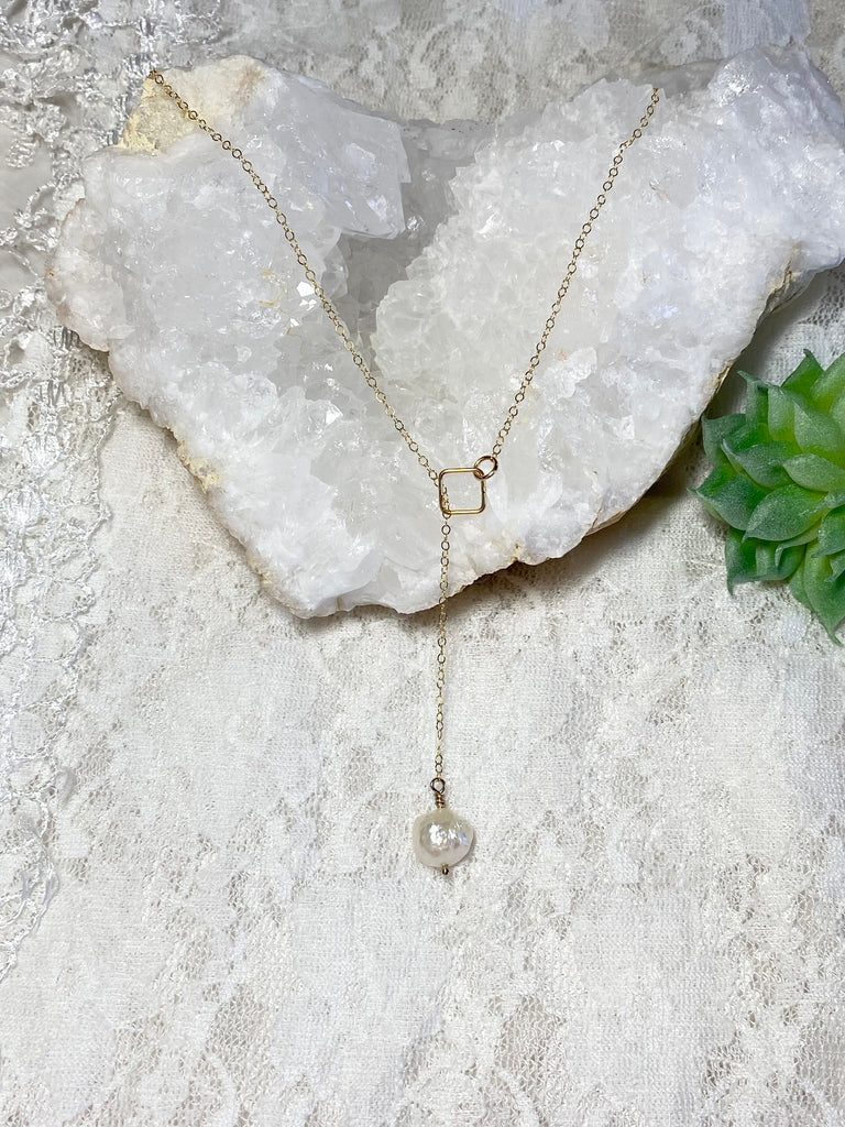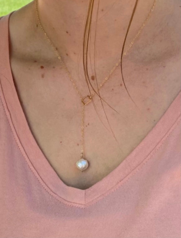 This is a unique little beauty with an 18” adjustable center drop pendant with a beautiful baroque pearl available in 14k Gold Filled. We love the unique look with a classic baroque pearl it adds a touch of class to any outfit.