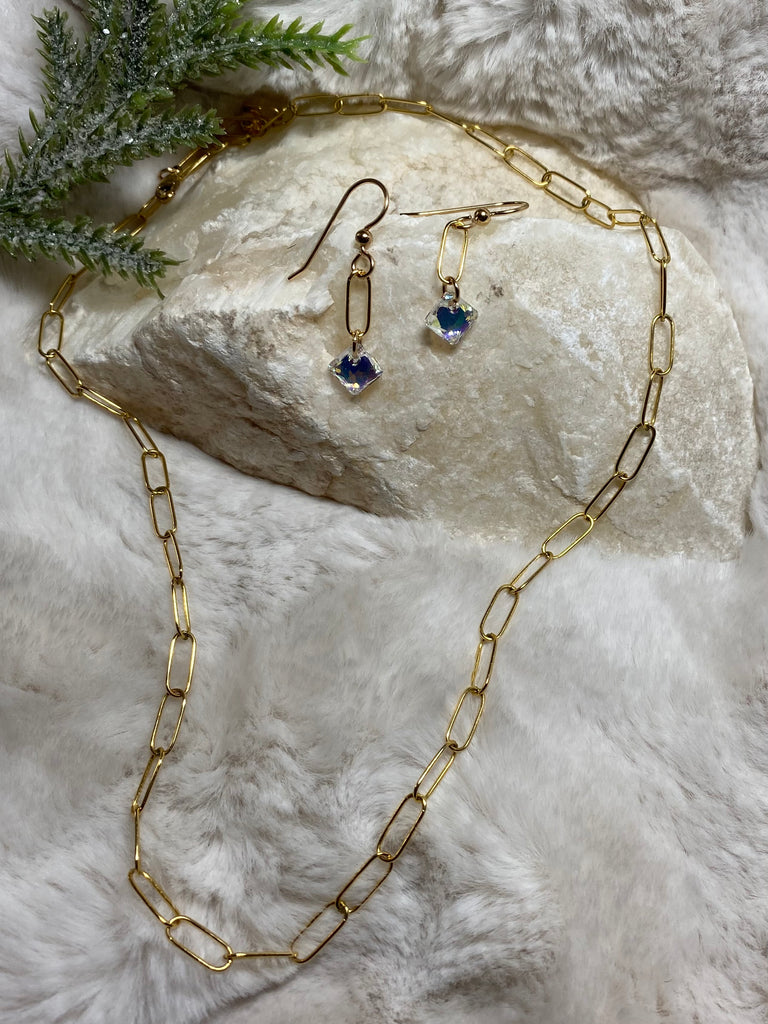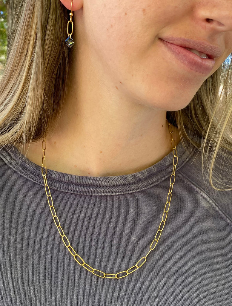 This is a gorgeous versatile paper clip necklace. It adds great texture when layering with other necklaces It’s light weight. You can clasp it in the front or the back at any length for an easy fit. the Matching Earring Complete this beautiful look 14k Gold Fill available in 16” 18” 20” This is the gift shell love