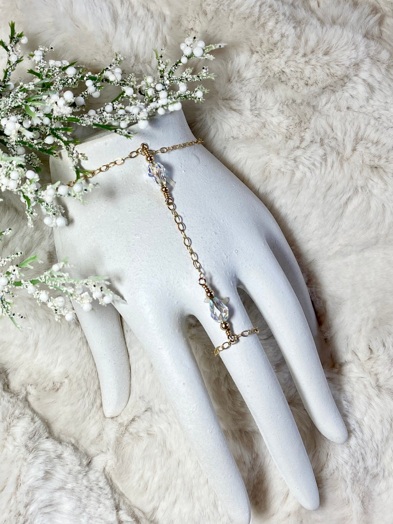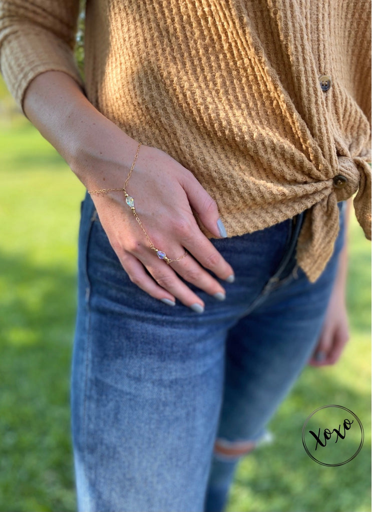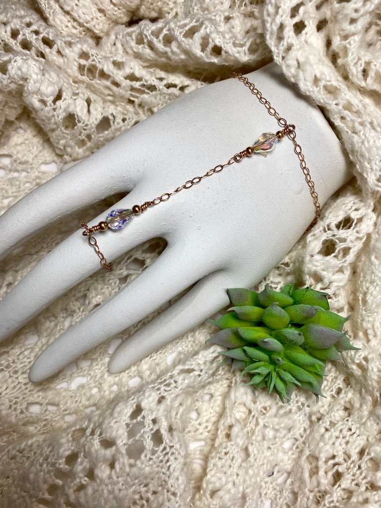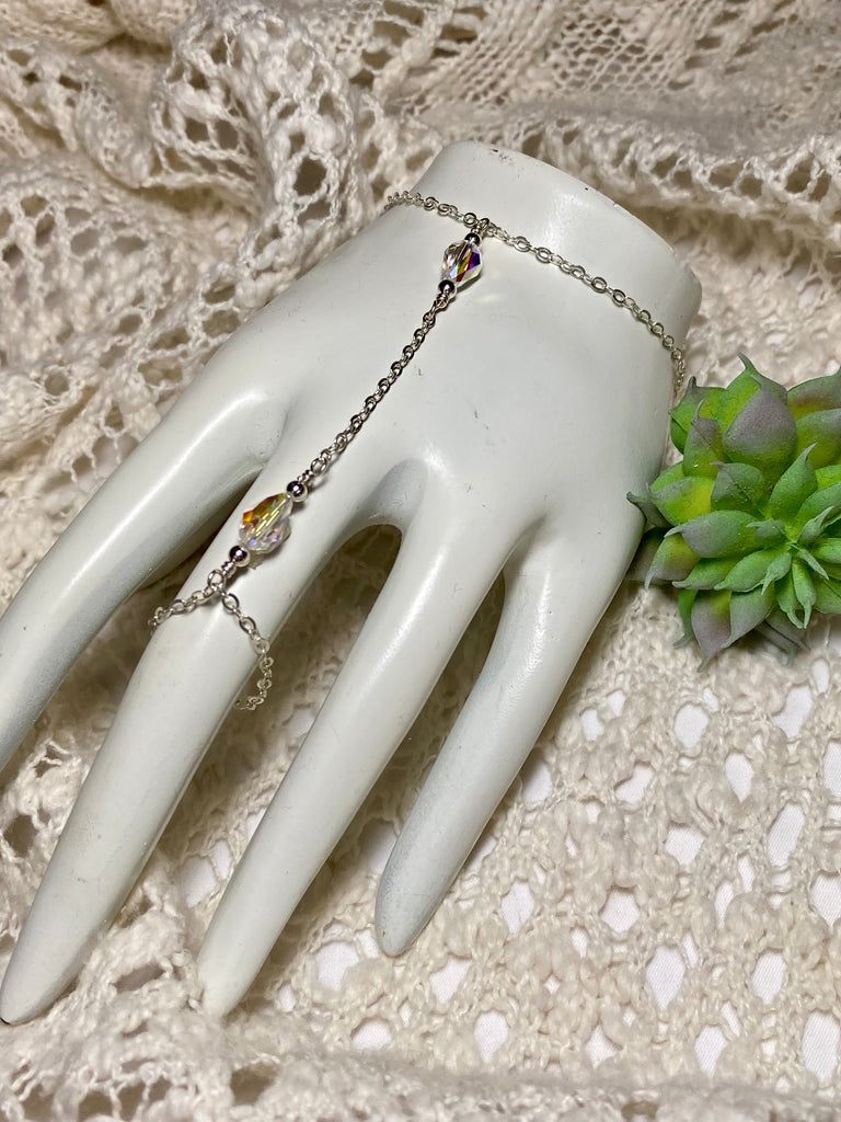 Love worthy! Our Gorgeous sexy ring bracelet is a favorite. This Very delicate feminine design is available in Sterling Silver, 14kt yellow or Rose gold Filled. It’s a beautiful accessory for any occasion. With Crystals in Aurora Borealis it adds just a hint of sparkle.