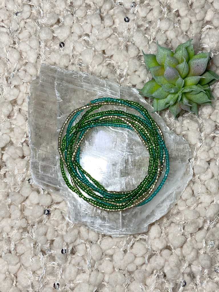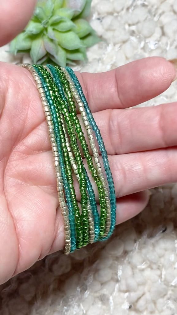 One of our most popular bracelets our Magic wrap is beautiful comfortable and fun these will quickly become your favorite. The wrap is a single strand of glass beads it slightly stretchy one size fits most. 1pc wraps 3 times Looks amazing mixing 2 or 3 strands.