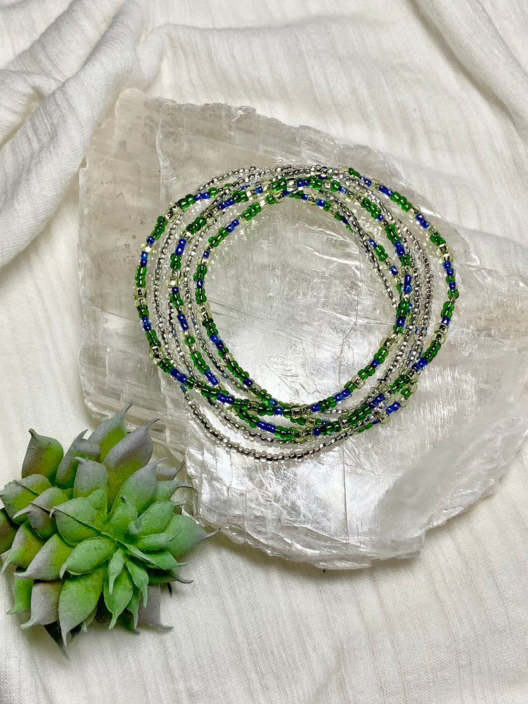 Our very popular Magic wrap bracelet is beautiful and so comfortable there fun these will quickly become your favorite. The wrap is single strand of glass beads, the wrap stretch bracelet is one size fits most. (1pc wraps 3 times) for bracelet. Our model is wearing 2 pieces it Looks amazing. You can choose 2 matching like our model or option B our sea spray wrap mixed with a silver wrap for more variety.