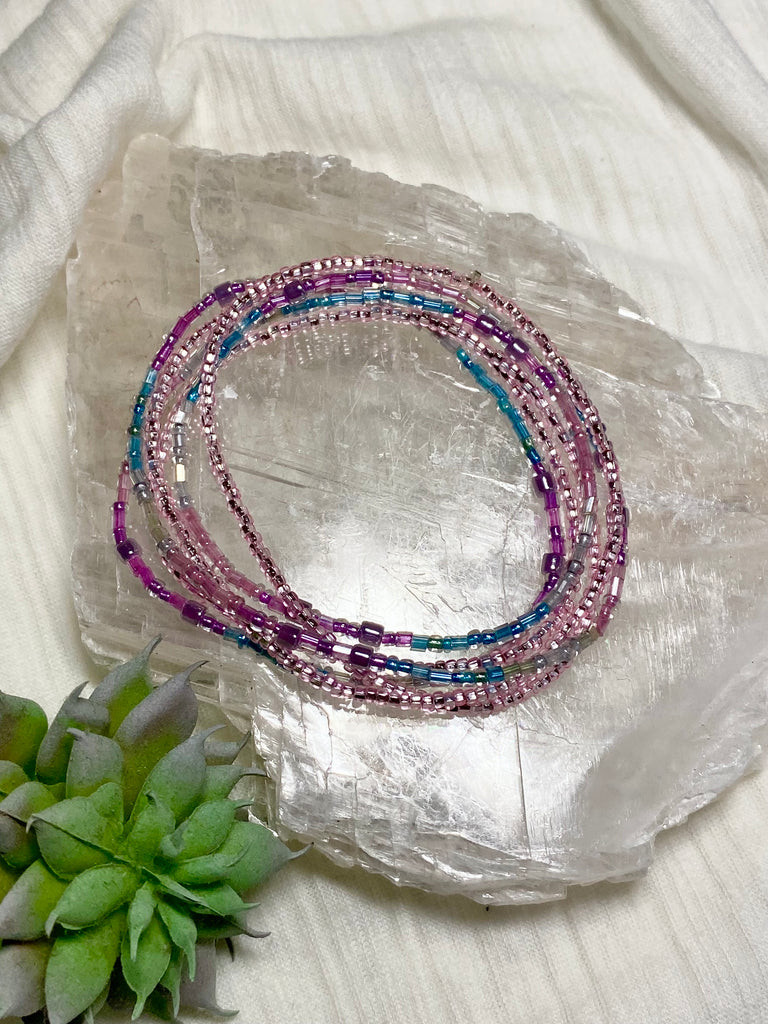 Our very popular Magic wrap bracelet is beautiful and so comfortable there fun these will quickly become your favorite. The wrap is single strand of glass beads, the wrap stretch bracelet is one size fits most. (1pc wraps 3 times) for bracelet. Our model is wearing 2 pieces it Looks amazing. You can choose 2 matching like our model or option B our Hello Spring wrap mixed with a pink wrap for more variety.