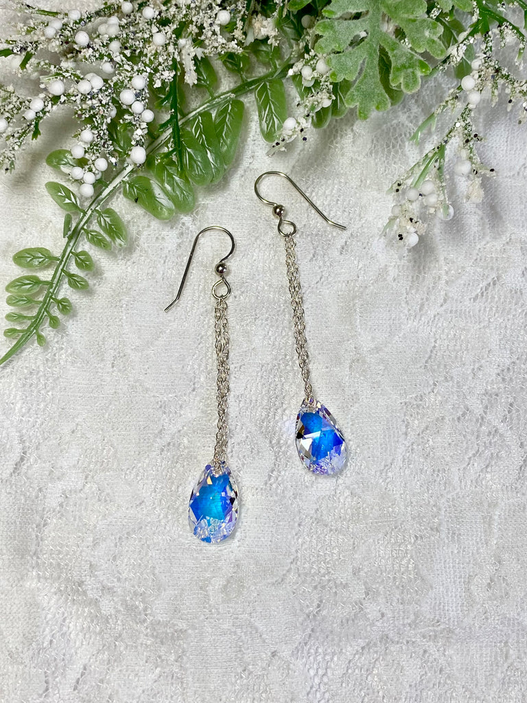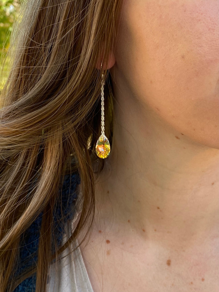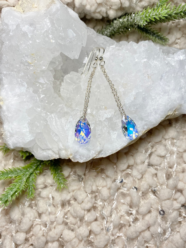 There simple! There elegant! Our Crystal drop earring are so Beautiful designed with a soft pear shape Available in Sterling silver or 14k gold filled. Size 2 1/2” They dress up for a formal event or down for a simple evening out. They would be a beautiful addition to your jewelry collection.