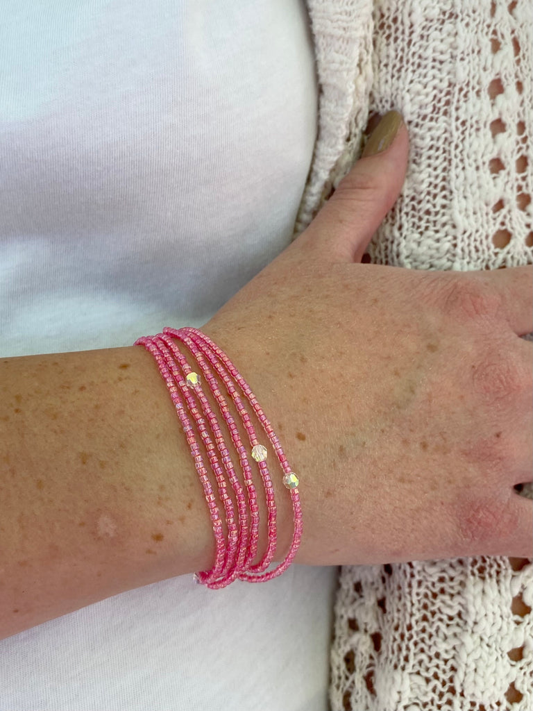 Our very popular Magic wrap bracelet is beautiful and so comfortable there fun these will quickly become your favorite. The wrap is single strand of glass beads with a touch of crystal it adds sparkle. Our wrap stretch bracelet are one size fits most. (1pc wraps 3 times) This is a bundle of 2 pieces. A kind and thoughtful gift to Celebrate a survivor.