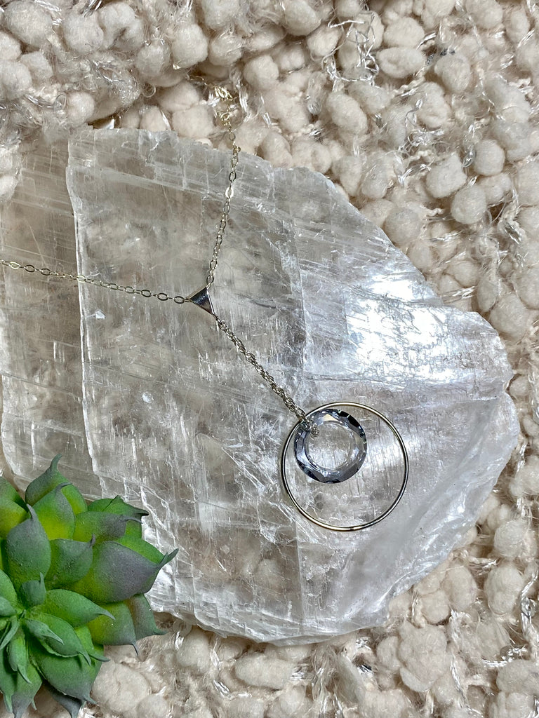 Wow we love this beautiful Crystal! the colors are amazing this unique whimsical necklace is designed with a 1” hoop and a Crystal center on a 2” drop pendent necklace. Available in Sterling Silver or gold filled 16”18” it’s lightweight and fun, a complement to any outfit.