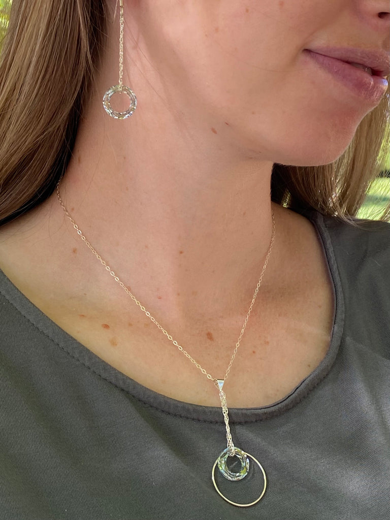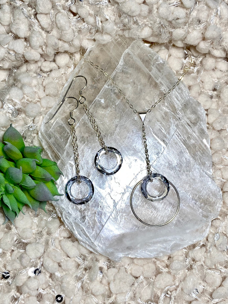 Wow we love this beautiful Crystal! the color is amazing this unique whimsical necklace is designed with a 1” hoop and a Crystal center on a 2” drop pendent. Available in Sterling Silver 16”18” it’s lightweight and fun, a beautiful addition to any outfit complete the look with the matching earrings size 2“ Gifts sets are always a great choice. Make shopping so easy!