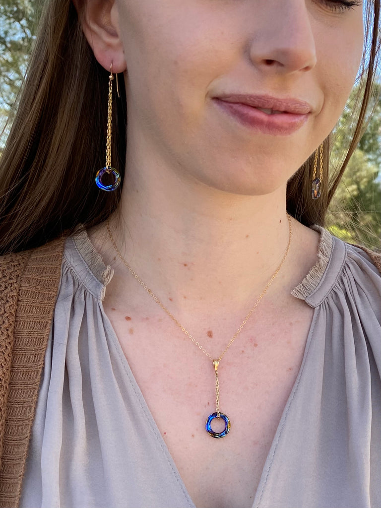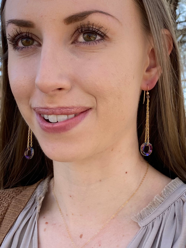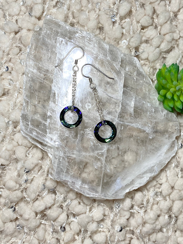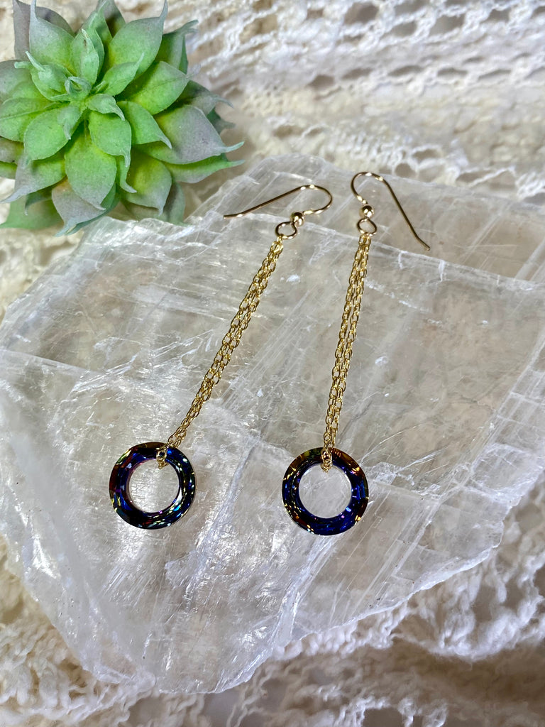 Wow we love this beautiful Crystal, both colors are amazing. They’re lightweight great for day or evening. Available in Bermuda blue and sterling silver or Volcano and 14k gold filled, size 2” we know you’ll love them.